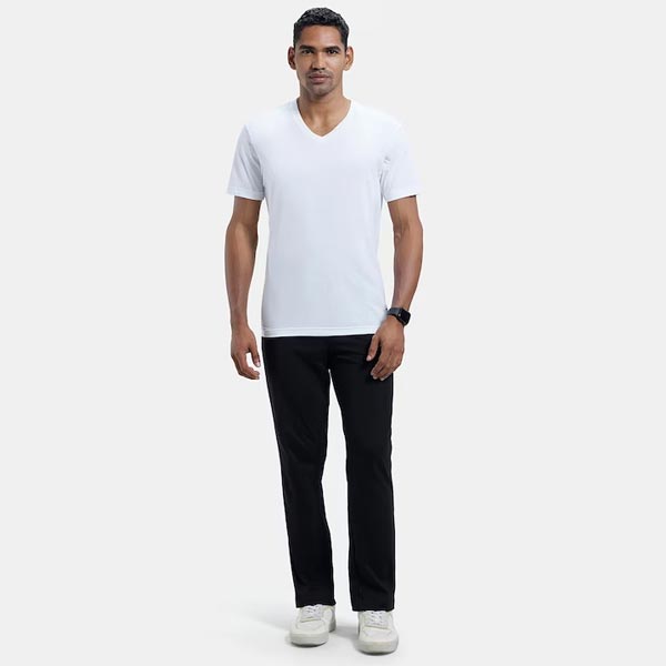 Track pantsA pair of black solid track pants, has an elasticated waistband with drawstring closure, two pockets